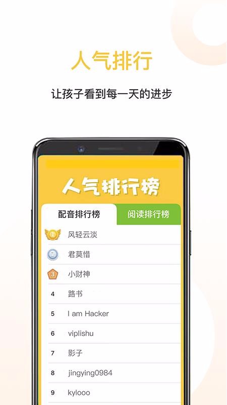 1、展示两种不同的学习排行栏目,分别是配音排行和绘本阅读排行两个栏目;