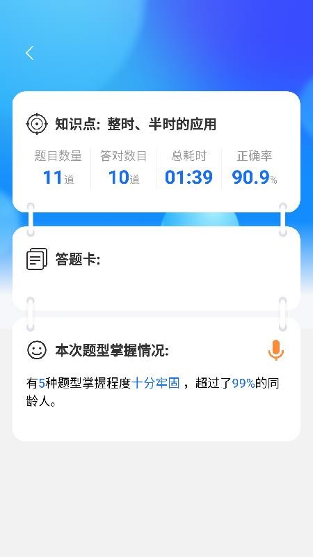 2、在这里,用户能够看到自己的答题数量、答对数量、耗时和正确率等信息;