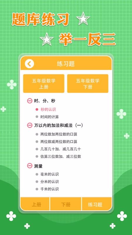 五年级数学上册下册是一款数学学习软件,为小学阶段学生提供专业的数学教材资源,拥有非常科学的学习环节;软件将五年级阶段的数学划分为上册和下册选择栏页面,每个学年阶段都展示了该学年的基础学习知识要点,还有同步的课本教材图片资源,这些图片同步了教材中不同的动画教材场景画面,有了该软件就不需要再用纸质教材了,因为上面也能看到里面清晰的引导内容;除了同步教材的学习课本内容外,还收录整合了两册不同的练习题目资源,在练习题中心划分两种不同学年的练习选择,里面有清晰同步的练习题目内容。