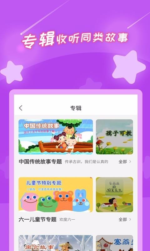 1、拥有各种故事专辑,轻松收听同类故事,比如中国传统故事、六一儿童节等专辑;