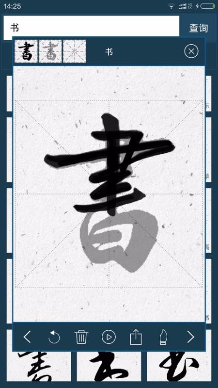书法大字典app是可以临摹书法的智能软件;这款软件有海量的书法家真迹,用户可以按照分类选择字帖,行书、楷书、草书以及隶书等字体应有尽有,支持用户尽情浏览;还可以自主输入文字检索字帖,能够快捷浏览众多的真迹,查询更省时;不仅如此,这里还支持随意临摹,临摹后可以立即播放预览效果,笔画情况一目了然;还可以直接导出个人临摹的作品图片,能够完整保存至本地,随时可以查看使用;还可以自主设置临摹的笔头,笔头粗细自由调节,助力用户更轻松的临摹,喜欢书法的朋友赶紧下载开始学习吧。
