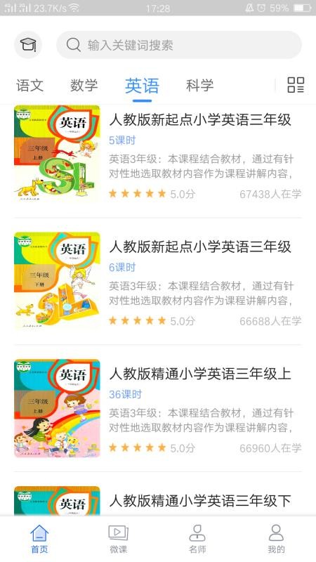 2、查看应用首页中提供的语文、数学、英语、科学等学科的学习课程
