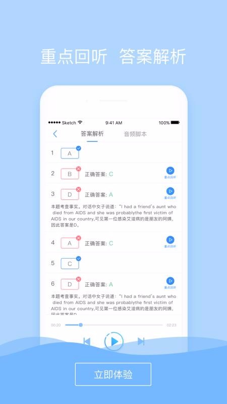 3、自由的收听模式,一旦识别到相应的答题卡内容后就能重复收听其中音频;