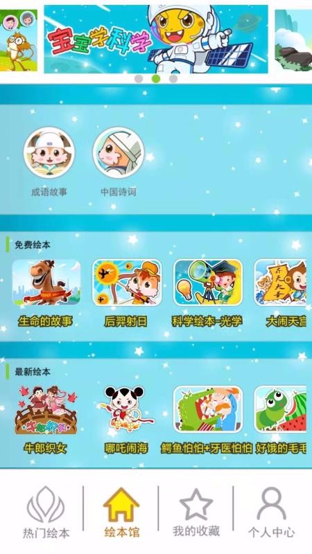 3、简洁的主要绘本馆划分版块,该页面将所有绘本按照成语故事和中国诗词进行了划分;