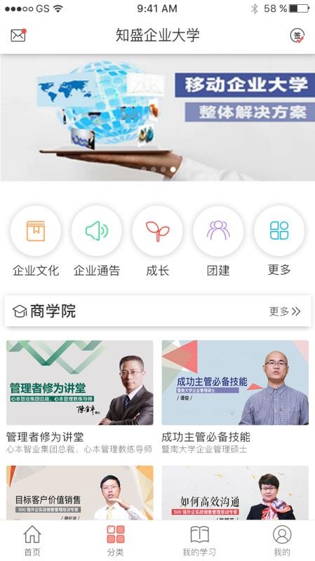 1、进入应用分类页面,查看提供的企业专区和推荐的课程