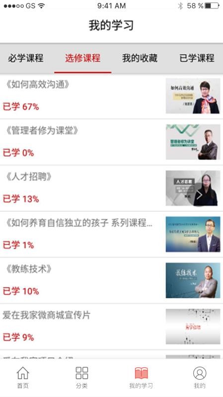 3、设置有必学课程、选修课程、我的收藏和已学课程专区,了解课程的信息;