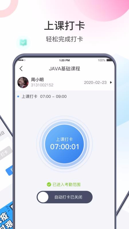5、学生在线即可完成考勤打卡,自动推送打卡记录到老师端,并通过列表形式展示考勤信息;
