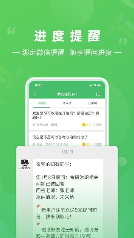 1、支持绑定微信提醒,实时查看问题解答的进度,提醒用户查看提问回答的内容;