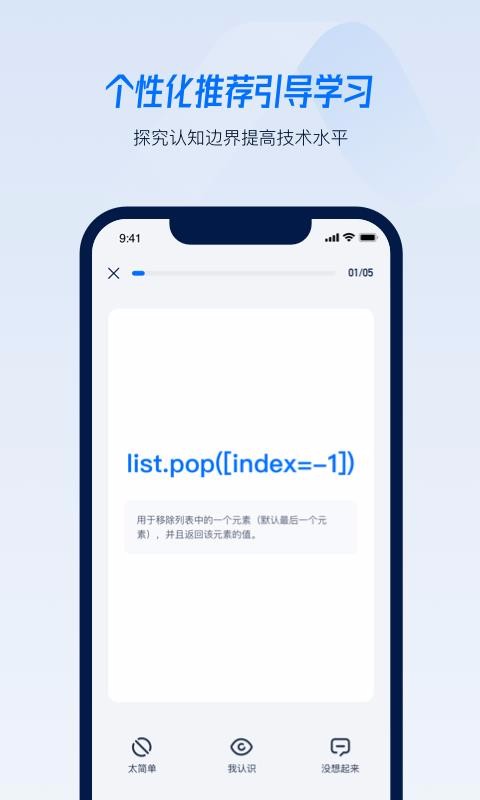 python小抄是一个卡片式学习助手,将各种知识列成卡片的形式,逐一推送给用户进行记忆,并根据艾宾浩斯记忆曲线,智能推荐适合的学习卡片;用户可以使用该软件来学习数字化内容,随时为你推送热门卡组,选择卡组即可添加并开始学习;自动统计并显示正在学习的数量,每个卡组都标注了学习进度,选择卡组进入详情页面,即可查看统计的新学习和需要复习的数量,以及预计学完的时长;在学习过程中,查看展示的卡片知识后,可以根据情况选择太简单、我认识或没想起来,该软件就会根据用户的选择调整推送的内容。