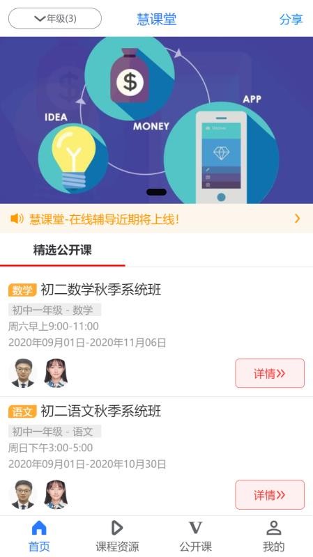 慧课堂app是一款多功能的学习类软件应用,它主要以中小学课程为重点,让用户可以接受到专业的课外辅导,帮助用户提高学习效率,提升自己的学习成绩;在这里,拥有丰富的课程资源,多种多样的学科为用户提供,涵盖了语文、数学、英语、生物、物理、化学等等,用户可根据自身的需要,自由的选择对应的课程,快速的进行学习;不仅如此,还为用户划分了年级,让用户能按照自己的所处年级,学习到适合的课程,针对性的学习该年级阶段的各种课程知识,非常的具有实用性;还等什么,如果有学习的需要,那就赶快下载体验一下吧。