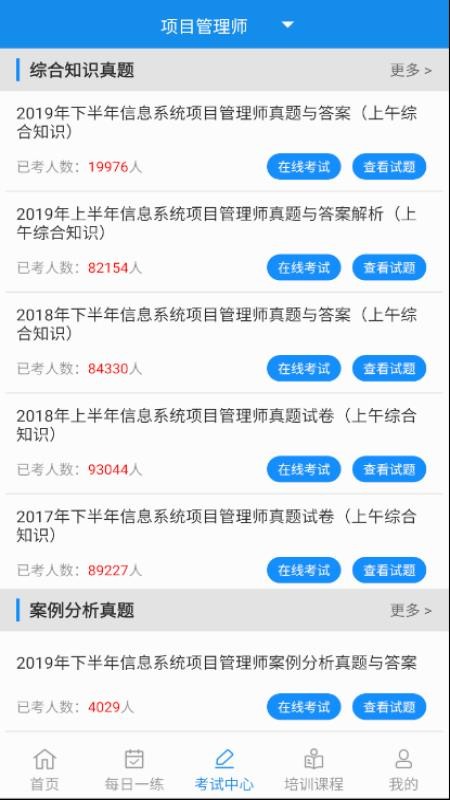4、进入考试中心,查看不同类型的真题信息,选择不同题目在线考试