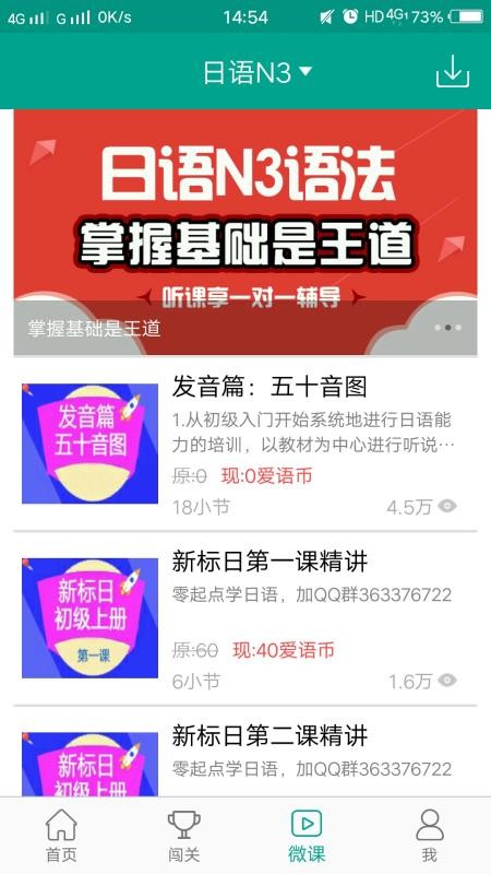 日语N3是一款日语知识在线学习软件,让用户能够更轻松的学习日语,轻松通过日语等级考试;应用中有多种功能,用户可以在这里看到各种类型的课程信息,了解各课程主要内容,从而选择更合适的课程进行学习;用户通过软件可以在线进行知识闯关,通过闯关的方式更轻松的记忆日语单词,让学习变得更加有趣且轻松,提高学习效率;在这里,用户还可以清晰看到自己的学习情况,了解自己的做题进度,合理安排学习时间,从而能够顺利通过考试;快下载这款软件试试吧,在线学习各种类型的日语知识,轻松通过日语等级考试。