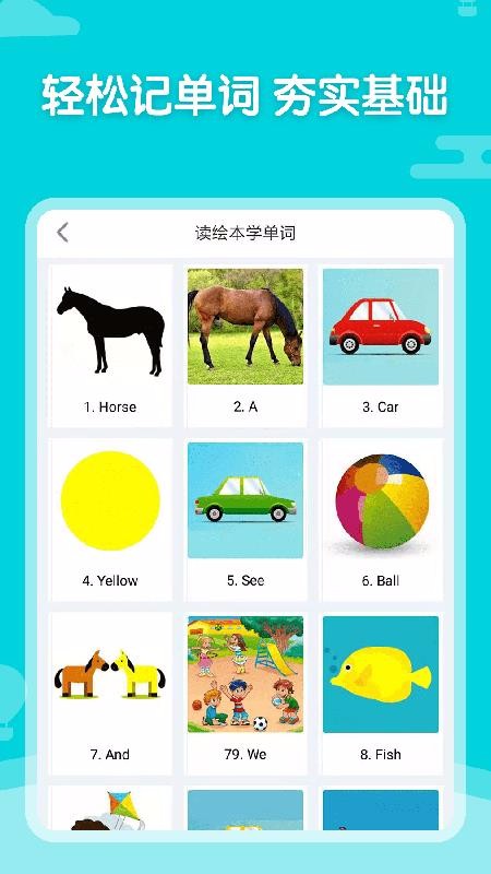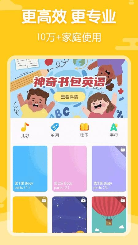 神奇书包英语是一款英语学习软件,专注于0到8岁之间的儿童,开设了儿歌、单词以及绘本多种资源专区;软件中整合了大量简单的英语单词,可以通过读绘本的方式学习其中的单词内容,里面每一个单词都拥有专属的卡通插画配图,通过这些配图能让小孩们增加单词学习兴趣;整个软件都采用了寓教于乐的趣味教学方式,创造了一种轻松愉快的学习环境,为父母提供了非常有帮助的学习工具,培养小孩的英语基础能力;里面还提供海量的英文热歌资源,这些儿歌都可以免费播放收听,只要点击即可播放音乐并锻炼小孩的听力。