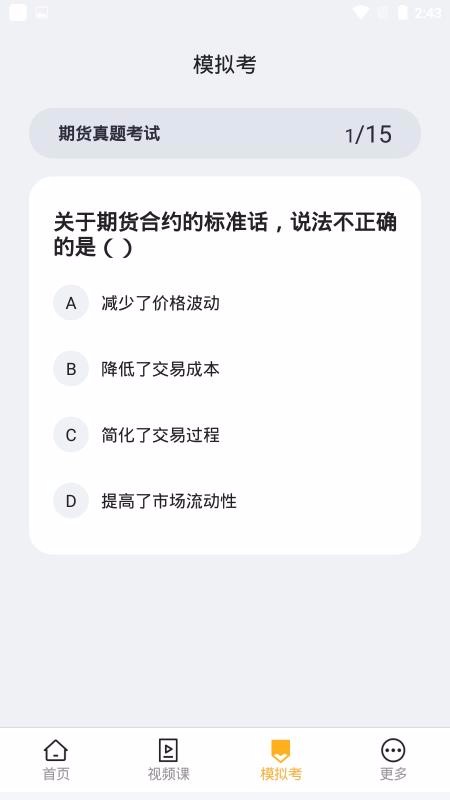 6、简单高效的模拟考页面,这里面为用户提供了15题一组的考试练习模式;