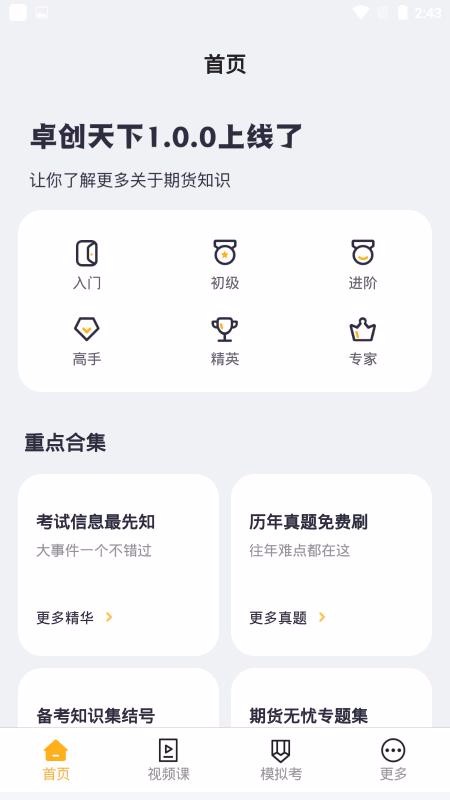 卓创天下是针对期货从业资格备考设置的学习平台,为备考人员提供入门、初级以及进阶等不同阶段课程资源;首页设置了基础知识了解课程专区,还设置了重点集合专区,在基础知识了解专区主要提供认识与了解类的课程,在重点合集专区展示了关于考试方面的资源和服务版块;针对普通的期货理财投资者提供相应的课程资源,可以根据自己的等级选择入门级别的课程并学习,初步了解期货的各种内涵,学会入门知识后就能打开初级专区并从中挑选初级课程学习;如果是需要备考的同学的话就能在重点合集汇总点击历年真题免费刷专区,打开挑选真题练习。