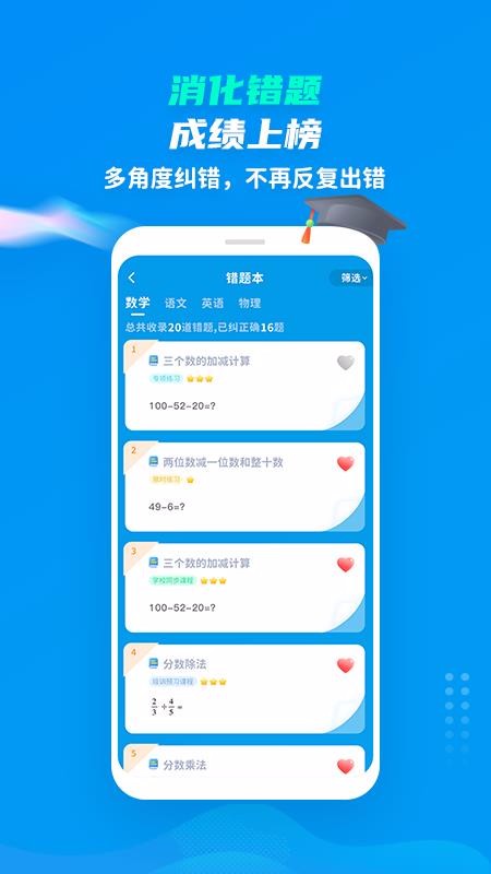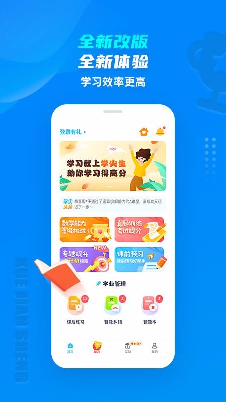 1、丰富的学业管理功能图标,该管理功能栏中有课后练习、智能纠错以及错题本多种功能;