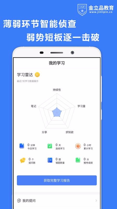 5、进入我的学习页面,查看展示的学习雷达和提问记录,可以获取完整学习报告进行查看