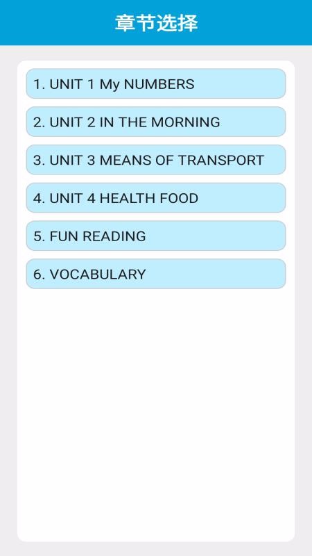 4、一目了然的章节选择页面,章节选择里面展示了每一个单元和相应的单元主题;