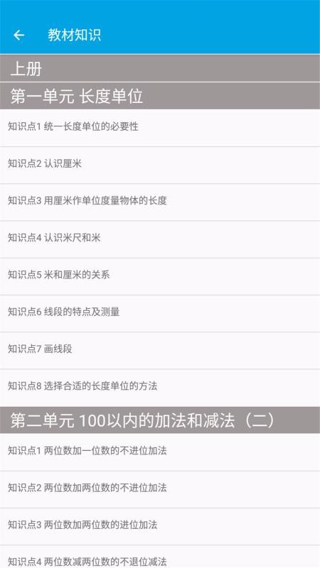 小学数学二年级是一个数学学习软件,提供了小学二年级的数学教材,让学生可以巩固教材内容;在线即可学习教材知识,可以根据单元进行浏览,分类展示了每个单元的知识点,选择知识点即可查看图文详解;总结了上下册的考点知识,包括重要知识和考试方向,可以进行重点学习,也汇集了各种易错知识点和题型,选择题型即可查看相关的解题技巧;提供了与教材同步的课后答案,按照上下册、单元、章节等进行浏览,选择题目即可查看参考答案,让你轻松做题;随时可以查看关于该软件的介绍,了解该公司信息,并提供了联系客服的途径。