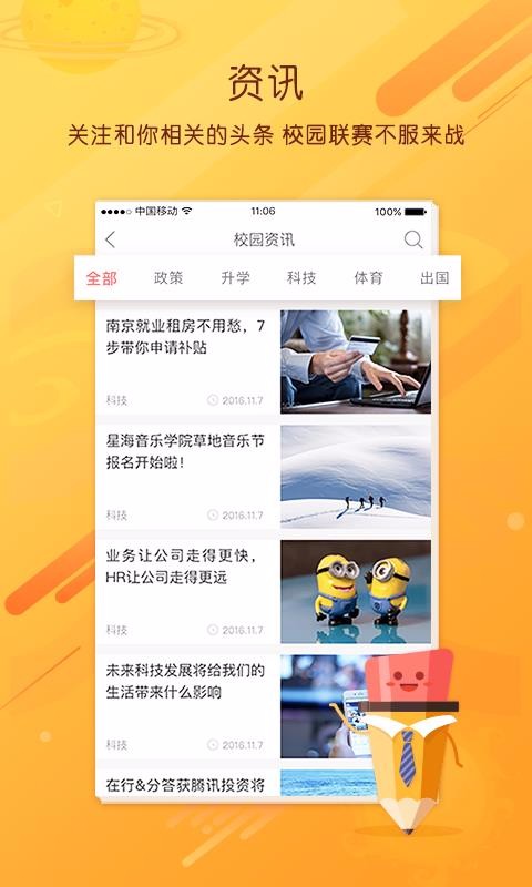 4、拥有丰富的校园资讯中心,该中心展示了政策、升学以及科技和体育多种资讯类别内容;
