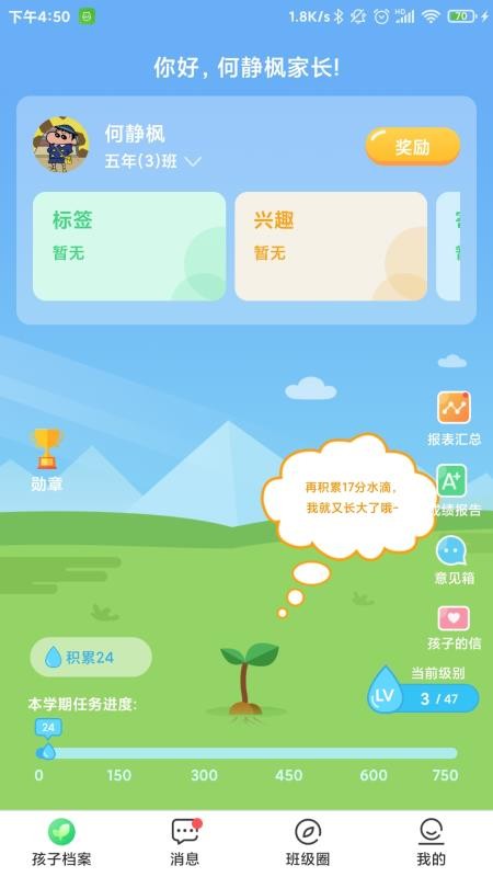 2、在首页中查看孩子的档案信息,了解孩子当前任务完成情况和孩子的兴趣爱好
