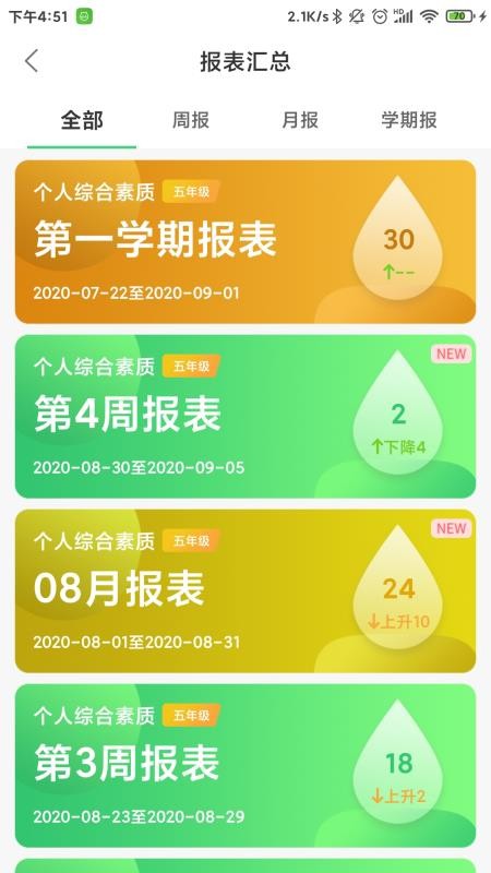 6、应用中有多种类型的报表汇总内容,让用户了解孩子周报、月报和学期报详情;