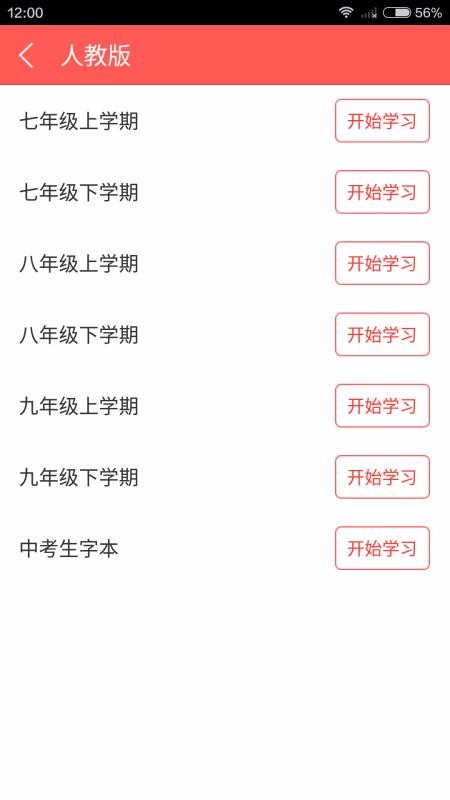 3、点击进入学习页面,选择相应年级的词汇,立即学习