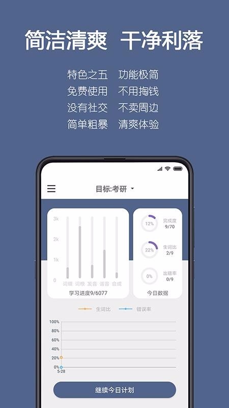 1、界面简单清爽,功能极简,并且免费使用,没有社交、会员、付费等功能,让你专注于背词;