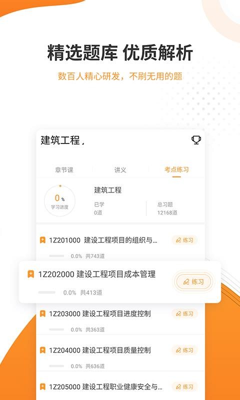 一建考试准题库app是专为准备备考一级建造师的用户提供的一款手机学习软件,这里能够为用户提供大量优质的一建考试题库,覆盖了各种类型的题目资源,并且还拥有大量的历年考试真题,能够方便用户随时随地通过手机在线刷题练习,轻松的在这里学习各种重要的知识考点;同时这里还拥有各种优质的视频课程,覆盖了全面的知识点,更有大量的直播课,你可以进入直播间与老师进行互动学习,得到更好的学习效果,并且系统还可以根据用户的做题数据自动的为您生成学习报告,让您可以更好的了解自己的学习情况。