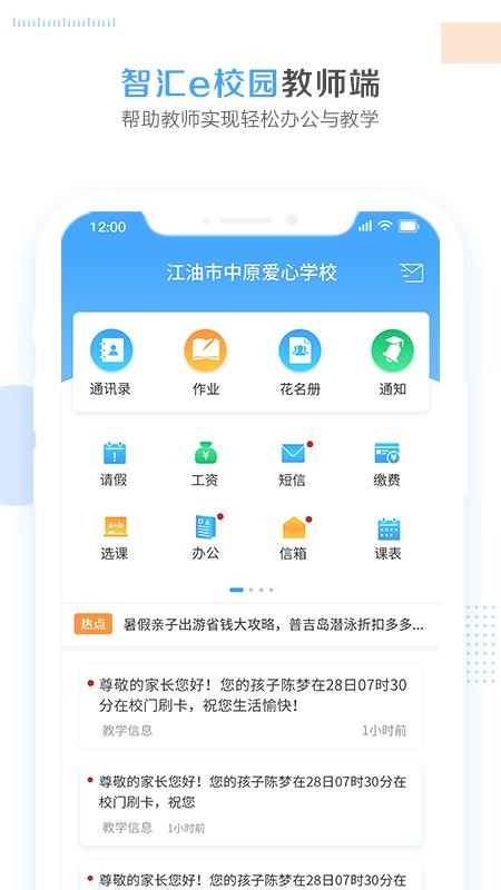 智汇e校园app是一款专业的教育管理类软件应用,该应用主要为家长和教师打造,可以帮助用户快速的了解到孩子的在校情况,带给了用户便利;在这里,实时的为家长监测了学生的行动,在手机上就可以快速的掌握孩子的在校信息,让家长可以及时的了解和关注到孩子的学习和生活状态,非常的实用;同时,每一位家长都可以自由的和老师进行沟通交流,支持多种聊天方式,向老师询问孩子的在校表现,轻松即可获取到孩子的各种活动信息;应用拥有请假功能,用户可在线为学生请假,填写请假事由,即可快速的发送请假条给老师,让老师完成请假审批,十分方便。