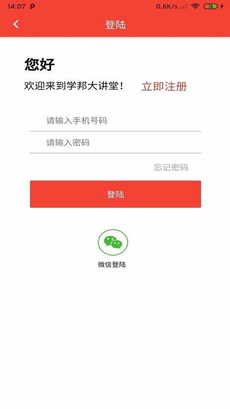 1、点击学邦大课堂app下载安装至手机,立即使用微信登录