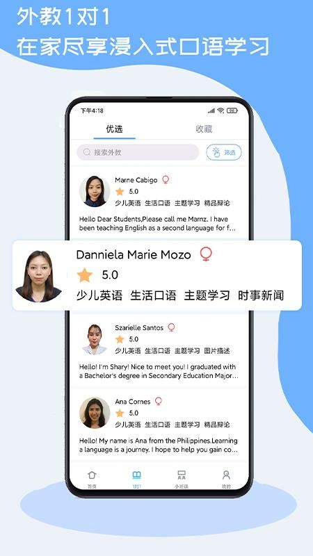 4、这里的所有外教均拥有本科及以上高等教育背景,教学经验丰富,让您轻松进入全英文语言环境;