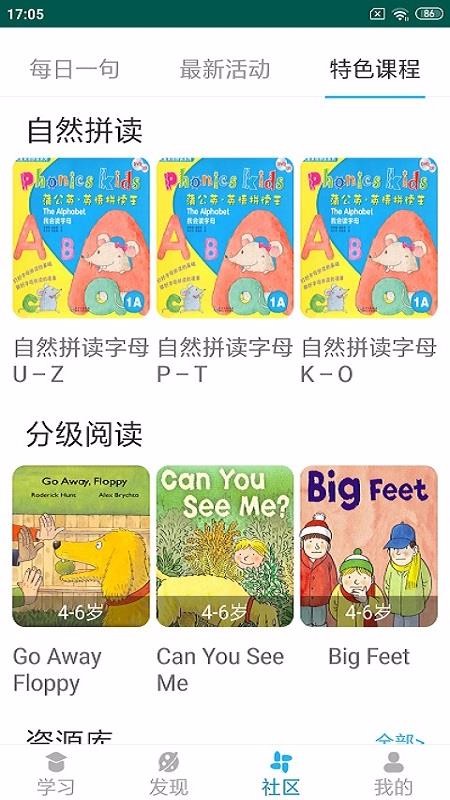 5、切换到社区中并点击特色课程,挑选自然拼读中分段课程并进入学习拼读技巧