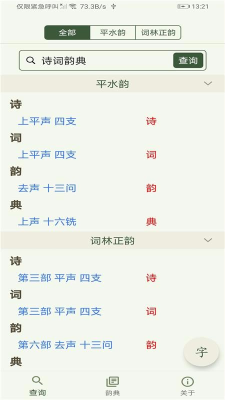 2、马上点击查询标签即可查询结果,点击页面的字悬浮图标查看具体汉字韵律