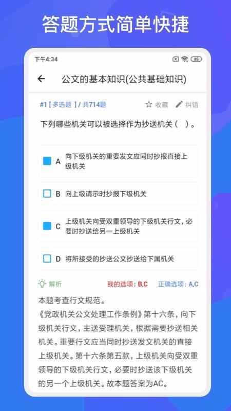 多练事考题库是专门为事业单位考试提供的题库软件,在线即可练习各种考点,并查看练习的数据;根据分类进行考点专项练习,可以切换省份进行查看,每个练习都展示了做题进度;选择题库并进入做题界面,查看题目描述后选择正确的答案,实时显示答案的对错,并提供了详细的解析;用户在浏览题目过程中,发现错误内容时可以进行纠错,提交正确的信息进行反馈;该软件也提供了错题集,统一收录了各种错题,让用户进行错题练习,重复练习薄弱的知识点;提供的练习题型也多样,包括单选题、多选题、判断题、简答题等,包含真实考试的各种题型。
