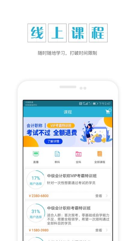 2、实时观看课程视频,提供直播和录播课程,随时在线观看视频学习;