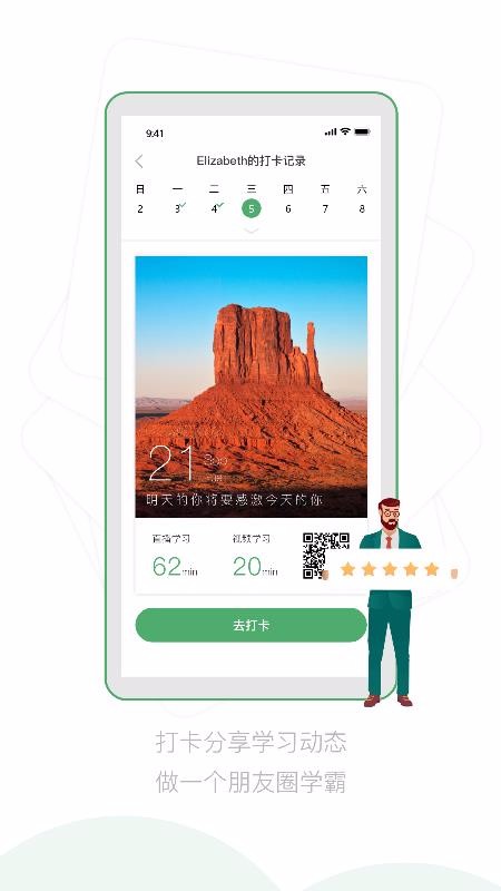 5、支持学习打卡,完成打卡后还可以进行分享,并提供了学习评分;