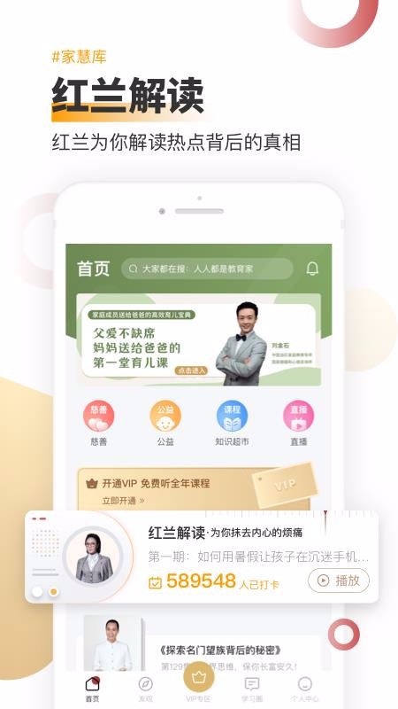 家慧库是一款家庭教育类的学习平台,覆盖了儿童成长、家风家教以及个人成长多种类型的教学资源;软件首页会推送展示丰富的各种服务专区,这些专区中涵盖了慈善、公益和知识库专区,可以进入到慈善服务中查看其中的慈善活动或项目,根据自己的需要参与相关的活动或项目;该软件还会为用户推送优质的家庭教育类课程,解决家长们在家里教育孩子过程中的各种烦恼,这些课程页面中还显示了当前播放学习该课程的打卡数量,通过该数量能判断课程热门程度;主功能栏中开设了VIP专区,里面推送各种VIP课程,还提供VIP相关服务。