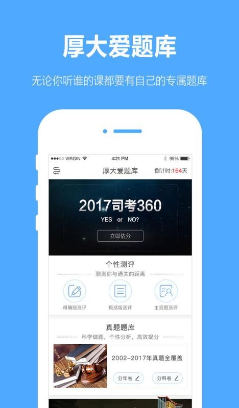 厚大爱题库app是专为备考司法考试的用户量身打造的一款手机学习软件,这里拥有海量优质的教育资源,覆盖了司法界的知名老师,能够为您提供大量的优质教学课程,让您可以在这里更好的进行学习,并且还可以为您进行测评,根据你的测评结果自动的为您制定你的学习计划,让你轻松的得到更好的学习效果;这里不仅为用户提供了大量 的学习课程,还拥有优质的题库资源,覆盖了大量的司法考试历年真题,并且每一道真题都有标准的答案和相应的解析,能够方便你更好的进行理解,从而掌握更多的知识内容,你也快来下载安装体验体验吧。