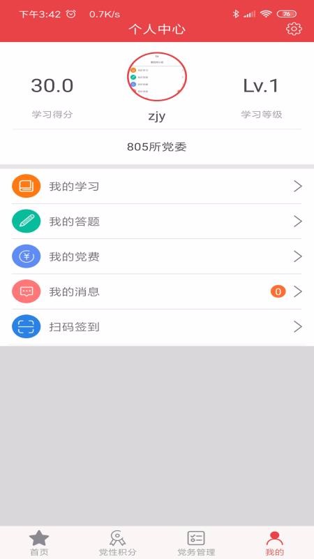 6、进入个人主页,选择查看我的学习、我的答题以及我的党费等