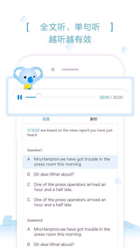 3、长按听力句子即可收听当前语音,自行调节听力的内容;