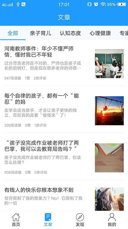 3、提供丰富多样的文章类型,包括亲子育儿、认知态度、心理健康等,随时切换;