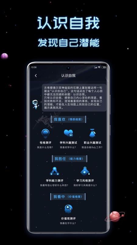1、提供多个情感维度测评服务,在认识自我页面中提供性格测评、学科兴趣测评以及职业兴趣测评多种测评服务;