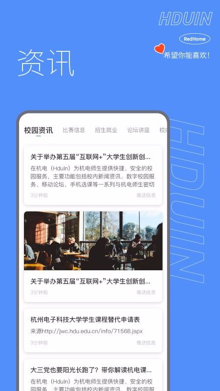 HduIn是一个校园服务类的软件,主要为学生们提供阳光长跑、一卡通以及课程表查询等丰富校园服务;学生们可以利用平台的阳光长跑服务记录自己的跑步数据,同步学校里面的运动健身目标,查看自己的跑步任务目标和完成状态等,还能看到自己之前跑步的历史记录和数据内容;软件还同步了学校里面的图书馆资源和服务,支持进入到图书馆页面中查看自己的书籍借阅历史,可以看到自己借阅的书籍是否马上到期,如果快到期的话还能继续借阅;平台开设了资讯中心,里面汇集海量的校园资讯以及校园比赛活动等多种类型的新闻信息。