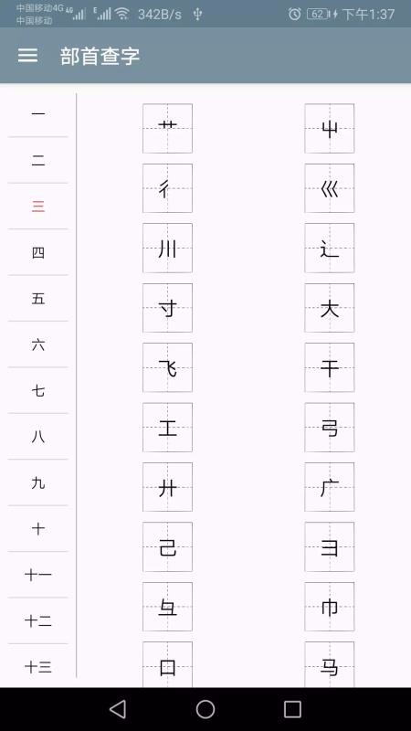 3、清晰有序的部首查字页面,该部首页面中的每一个部首都按照由简到难的方式排序展示;