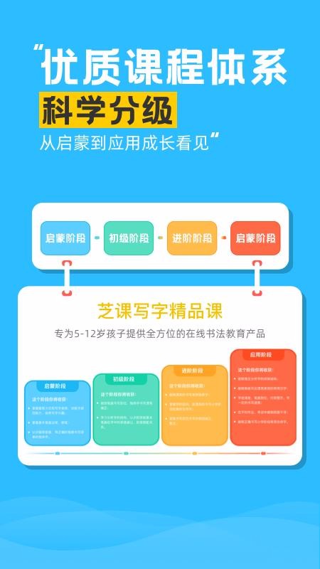 芝课写字是专业的书法学习app;这里提供优质的课程体系,致力于帮助每个孩子稳固基础知识,能够逐步提高写字能力,从而练就更加专业的书法;该平台提供真人教学模式,书法老师可以进行一对一辅导,及时有效的指导孩子,从而更明确的补足相应知识,高效学习;不仅如此,这里还有趣味闯关学习模式,能够有效的吸引孩子的注意力,可以让孩子主动学习,激发学习兴趣,从而帮助家长更省心的育儿;该平台提供针对性训练方式,可以及时查缺补漏,助力孩子更轻松地学习,赶紧下载这款芝课写字app开始学习吧。