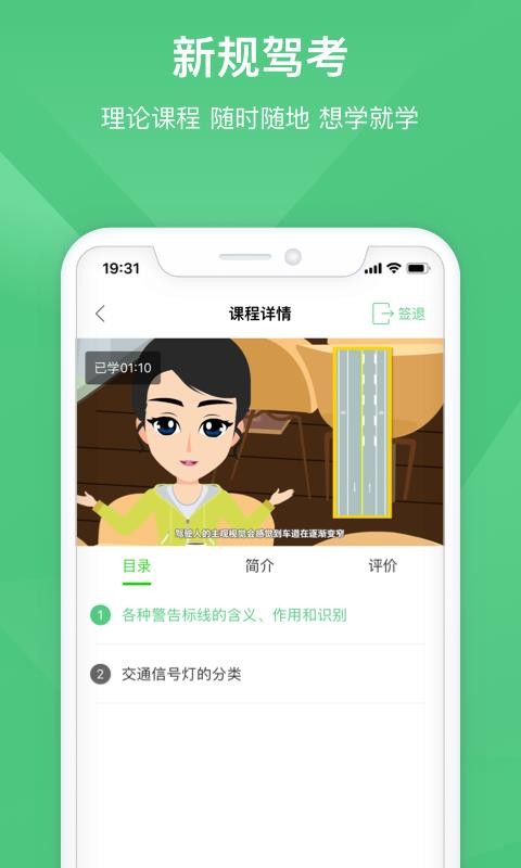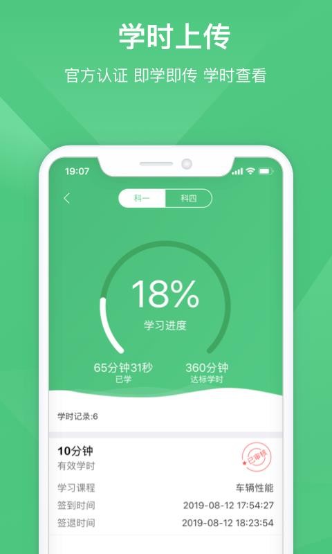 1、应用中有科目一和科目四的计时课程,用户通过计时课程可以积累自己的学时;