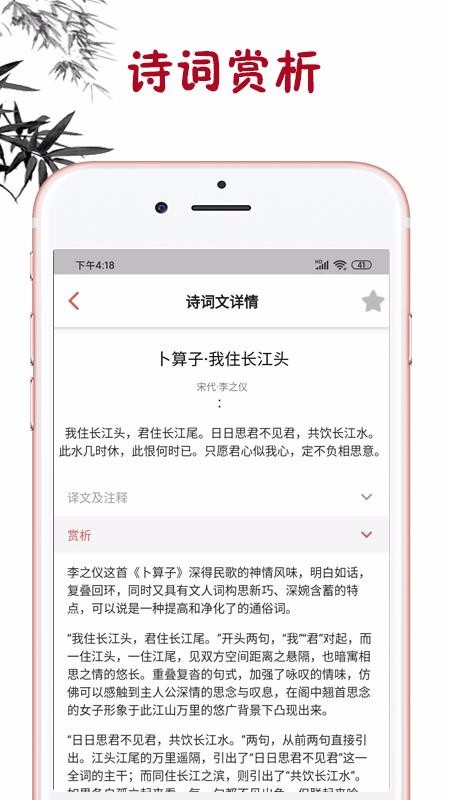 4、推送的诗词文详情更完整,赏析更详尽,方便用户及时选择阅读;