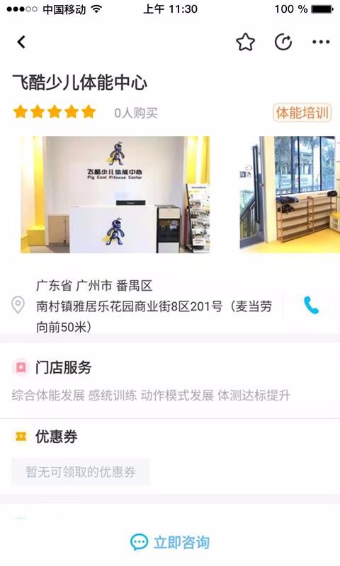 5、非常清晰多样的机构详情页面,这里面展示机构名称、位置、门店服务以及优惠券栏内容;