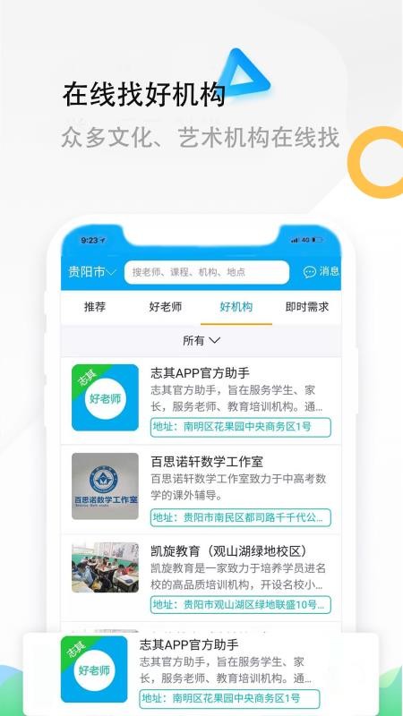 志其app是一款为学生提供学习机构和老师的平台,学生可以在线寻找学习辅导老师,提供海量优秀的老师信息,有不同科目的学习辅导老师,你可以查看老师的信息,找到合适的老师进行辅导学习,提高学习成绩;你也可以在线寻找辅导学习的机构,有很多文化、艺术机构在线,支持定位查看附近教学机构的信息,查看机构的介绍,寻找心仪的机构报名学习,和老师、同学一起面对面的学习,掌握更多的学习知识;同时可以在线观看视频学习,提供各个科目的教学视频,点击进入视频中在线学习,让学习变得更加轻松。